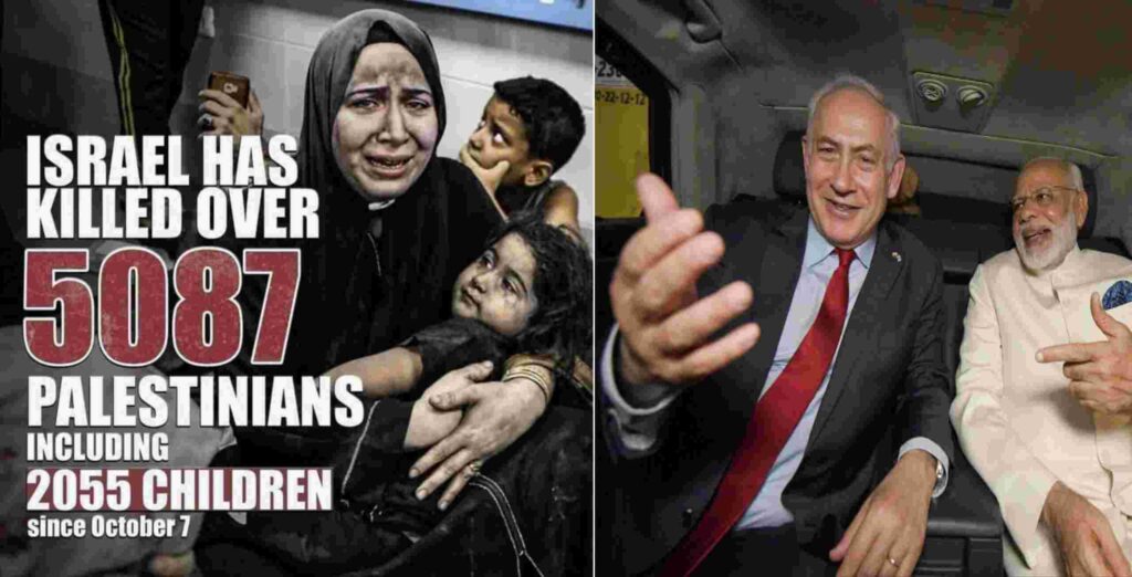 इन हिंसक दिनों में हमने कुछ हिन्दी न्यूज चैनलों पर ऐसे रेखांकन देखे जिनमें एक तरफ नरेंद्र मोदी जी और दूसरी तरफ बेंजामिन नेतन्याहू हैं और दोनों के माथे पर एक तरह का तिलक लगा है. यह विजय तिलक की तरह का ही कुछ है. यह चित्र ऐसा बताने का प्रयास करता है कि मोदी और नेतन्याहू इतिहास की समान भावभूमि पर खड़े हो कर कुछ नया रचने को कटिबद्ध हैं.