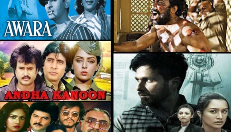 आवारा (1951), अब दिल्ली दूर नहीं (1957), कानून (1960), बात एक रात की (1962), आक्रोश (1980), अंधा कानून (1983), अभिलाषा (1983), मोहन जोशी हाजिर हों (1984), मेरी जंग (1985), एक रुका हुआ फैसला (1986), दामिनी (1993), दाग: द फायर (1999), क्योंकि मैं झूठ नही बोलता (2001), एतराज (2004), शौर्य (2008), नो वन किल्ड जेसिका (2011), शाहिद (2012), ओह माय गॉड (2012), कोर्ट (2014 मराठी फिल्म), बिसरनई (2015), जज्बा (2015), तलवार (2015), रुस्तम (2016), जॉली एलएलबी (2013 & 2017), पिंक (2016), भूमि (2017), मोम (2017), बत्ती गुल मीटर चालू (2018), मुल्क (2018), सेक्शन 375 (2019), क्रिमिनल जस्टिस (वेब सीरीज 2019), इलीगल-जस्टिस :आउट ऑफ ऑर्डर (2020), योर ऑनर (वेब सीरीज 2020), जय भीम (2021), कागज (2021), मातृ (2022), गिल्टी माइन्डस (वेब सीरीज 2022) आदि न्याय व्यवस्था पर बनी फिल्में हैं।