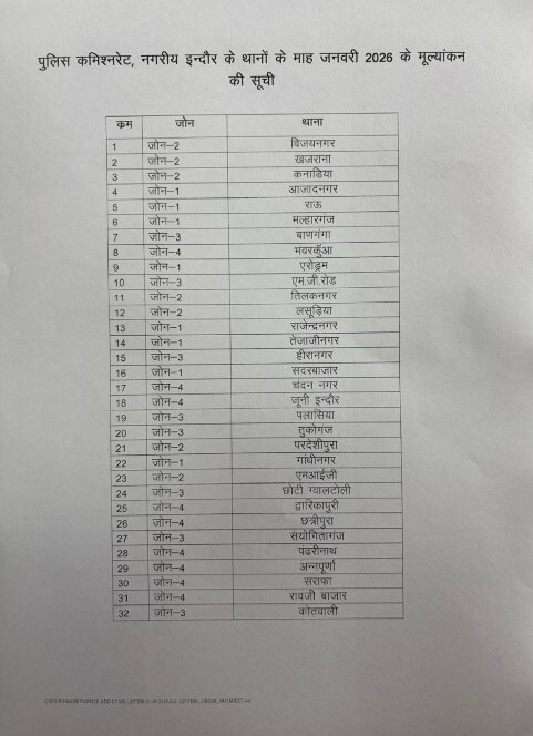 इसी आधार पर शहर में पहली बार पुलिस कमिश्नरेट के थानों का मूल्यांकन हुआ है. जनवरी महीने के परिणाम जारी हुए, जिसमें विजयनगर थाना टॉपर बना. खजराना थाना 90 अंकों के साथ दूसरे नंबर पर है और सेंट्रल कोतवाली थाना 15 अंक के साथ फेल हुआ. वहीं एमआईजी छोटी ग्वालटोली और द्वारकापुरी थाना ग्रेस मार्क्स के साथ पास हुए हैं. इंदौर पुलिस कमिश्नर संतोष कुमार सिंह ने शहरी क्षेत्र के 32 थानों की रैंकिंग सूची जारी की है.