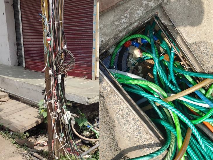 सड़क के पास बिजली के एक खम्बे पर तारों का जाल दिखाई दे रहा है। इससे बिजली के पोल पर कभी भी करंट फैलने का डर बना रहता है।