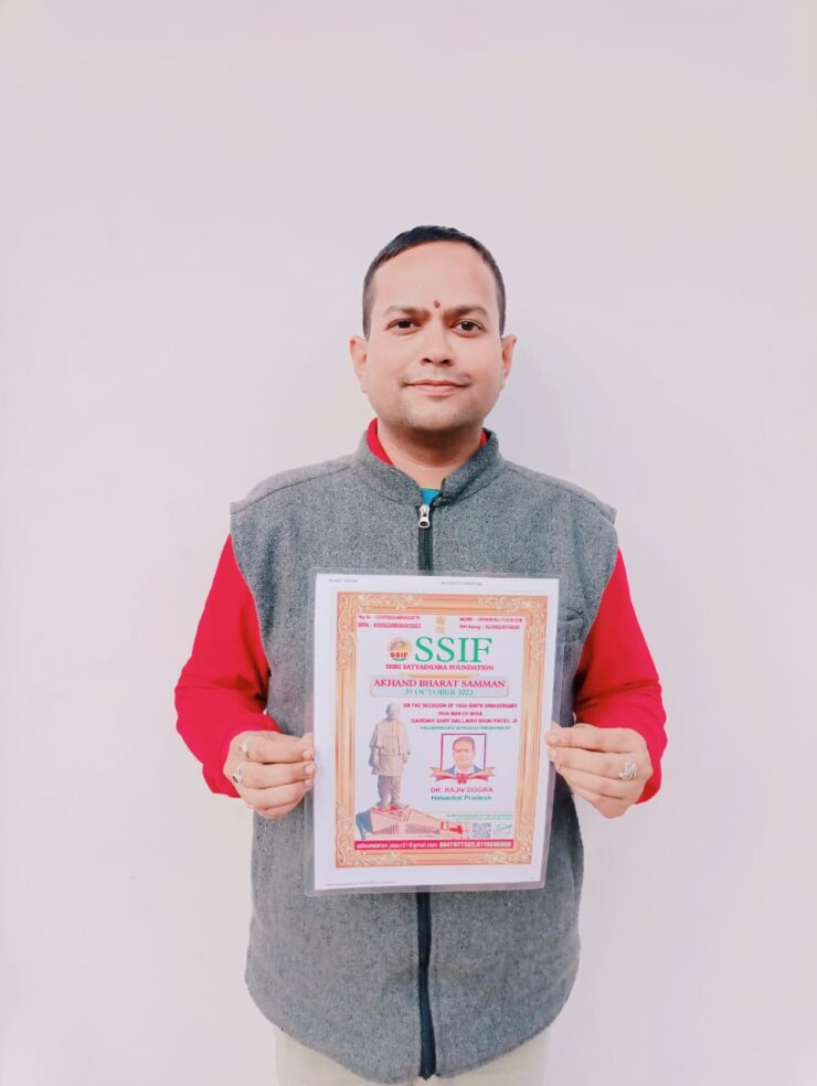 सत्यइंदिरा फाउंडेशन-SSIF जयपुर जो की शिक्षा, स्वास्थ्य, महिला एवं बाल कल्याण और धर्म, जाति और समाज के भेदभाव से ऊपर उठकर इंसान और इंसानियत के लिए कार्यरत है ने सरदार वल्लभभाई पटेल की 148 वीं जयंती के शुभ अवसर पर शिक्षा,शिक्षण तथा साहित्य में बेहतरीन कार्य करने के लिए कांगड़ा के युवा कवि लेखक और हिंदी शिक्षक डॉ राजीव डोगरा को अखंड भारत सम्मान 2023 देकर सम्मानित किया। राजीव को यह सम्मान संस्था द्वारा वर्चुअल माध्यम से प्रदान किया गया।डॉ राजीव डोगरा ने संस्था का तहे दिल से धन्यवाद किया।डॉ.राजीव के माता-पिता हंसराज तथा सरोज कुमारी और उनके विद्यालय के प्रधानाचार्य नीरज गर्ग तथा साथी अध्यापकों ने इस उपलब्धि पर डॉ.राजीव डोगरा को बधाई दी और उनके उज्जवल भविष्य की कामना की।