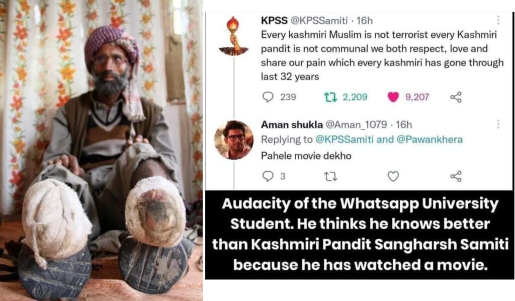 असलियत में 1990 के कश्मीरी पंडितों के जिस ‘नरसंहार’ और ‘जुल्म’ पर सिनेमाघरों के बाहर टेंसुएं बहाई जा रही है, उसी हत्या और नरसंहार के दौर में मरने वाले कश्मीरी पंडितों की संख्या महज 89 थी, तो वहीं मरने वाले कश्मीरी मुसलमानों की संख्या 1635 थी. आंकड़ों के इस संख्या को यह फिल्म स्पष्ट नहीं करती जिससे यह भ्रम की स्थिति बना दी गई मानो लाखों कश्मीरी पंडितों की हत्या की गई हो.
