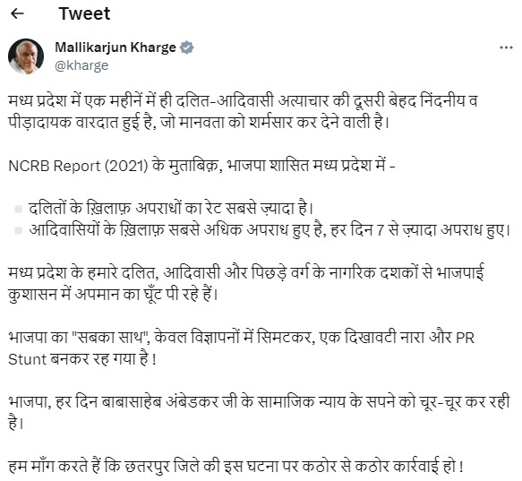 राष्ट्रीय अपराध रिकॉर्ड ब्यूरो (NCRB) की रिपोर्ट 2021 का हवाला देते हुए उन्होंने लिखा, ‘भाजपा शासित मध्यप्रदेश में दलितों के खिलाफ अपराधों का रेट सबसे ज्यादा है। यहां आदिवासियों के खिलाफ सबसे अधिक अपराध हुए हैं। हर दिन 7 से ज्यादा अपराध हुए। मध्यप्रदेश के हमारे दलित, आदिवासी और पिछड़े वर्ग के नागरिक दशकों से भाजपाई कुशासन में अपमान का घूंट पी रहे हैं।’