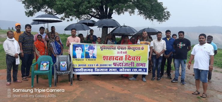 कोरबा। नरईबोध गोलीकांड की 25वीं बरसी के अवसर पर 11 अगस्त को छत्तीसगढ़ किसान सभा द्वारा भूविस्थापित एकजुटता दिवस का आयोजन किया गया तथा इस गोलीकांड में शहीद गोपाल दास और फिरतू दास को श्रद्धांजलि देते हुए इस क्षेत्र में विस्थापन से प्रभावित लोगों के लिए रोजगार और बसाहट के लिए संघर्ष तेज करने का संकल्प व्यक्त किया गया।