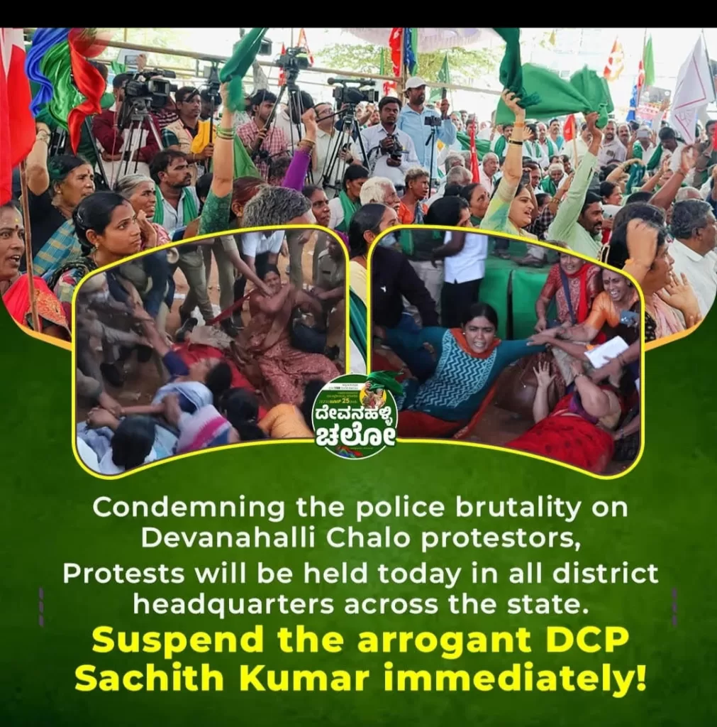 कर्नाटक के देवनहल्ली तालुक के चन्नरायपटना, हुबली में पिछले 1180 दिनों (लगभग 3.5 वर्ष) से संघर्ष कर रहे 13 गांव के किसानों पर 25 जून 2025 को पुलिस दमन की कार्यवाही किए जाने की किसान संघर्ष समिति ने निंदा करते हुए डीसीपी सचिन कुमार को बर्खास्त करने की मांग की है।उन्होंने कहा कि किसानों को बलपूर्वक घसीट कर हिरासत में लिया जाना देश के किसान संगठन कभी भी बर्दाश्त नहीं करेंगे।