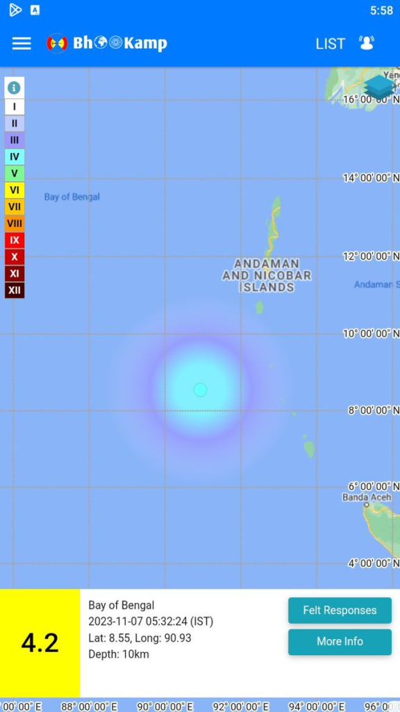 बंगाल की खाड़ी में एक बार फिर भूकंप के झटके महसूस किए गए हैं। राष्ट्रीय भूकंप विज्ञान केंद्र ने बताया कि मंगलवार सुबह 05.32 आए भूकंप की तीव्रता रिक्टर स्केल पर 4.2 आंकी गई है।