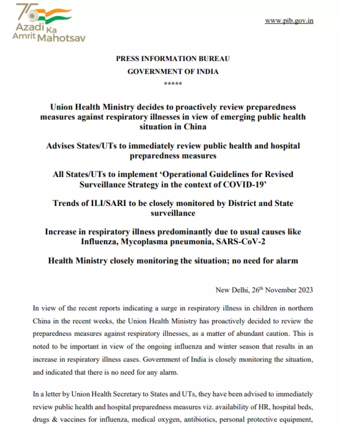 केंद्रीय स्वास्थ्य मंत्रालय ने चीन में उभरती सार्वजनिक स्वास्थ्य स्थिति को देखते हुए श्वसन संबंधी बीमारियों के खिलाफ तैयारियों की समीक्षा करने का सक्रिय रूप से निर्णय लिया है। राज्यों/केंद्रशासित प्रदेशों को सलाह दी गई है कि वे तुरंत सार्वजनिक स्वास्थ्य और अस्पताल तैयारियों की समीक्षा करें। सभी राज्यों/केंद्रशासित प्रदेशों को ‘COVID-19 के संदर्भ में संशोधित निगरानी रणनीति के लिए परिचालन दिशानिर्देश’ लागू करने होंगे। जिला और राज्य निगरानी द्वारा ILI/SARI के रुझानों की बारीकी से निगरानी की जाएगी। श्वसन संबंधी बीमारी में वृद्धि मुख्य रूप से सामान्य कारणों जैसे इन्फ्लूएंजा, मायकोप्लाज्मा न्यूमोनिया, SARS-CoV-2 के कारण होती है। स्वास्थ्य मंत्रालय स्थिति पर करीब से नज़र रखे हुए है; चिंता की कोई जरूरत नहीं है