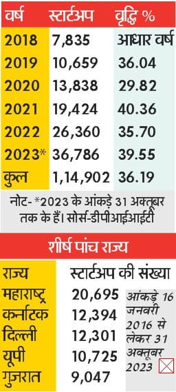 स्टार्टअप के लिए भारत दुनियाभर में तीसरा सबसे आर्कषक देश है। शानदार स्टार्टअप इकोसिस्टम के चलते भारत में हर साल 36 फीसदी की दर से स्टार्टअप बढ़ रहे हैं। महाराष्ट्र सबसे आगे है। 2023 में 36 हजार से ज्यादा स्टार्टअप को मान्यता दी गई।