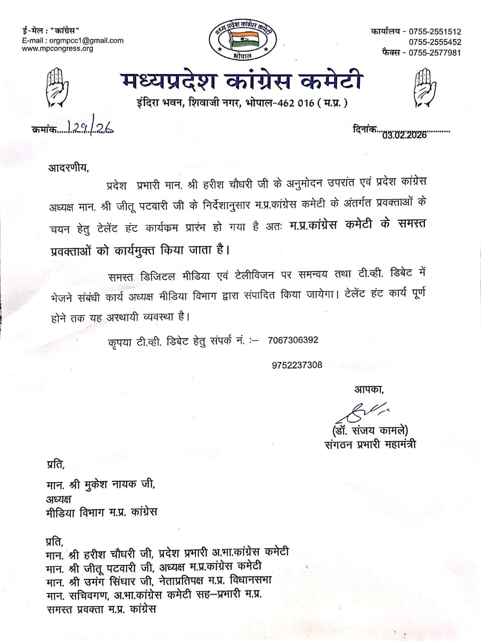 मध्य प्रदेश कांग्रेस के सभी प्रवक्ता कार्यमुक्त