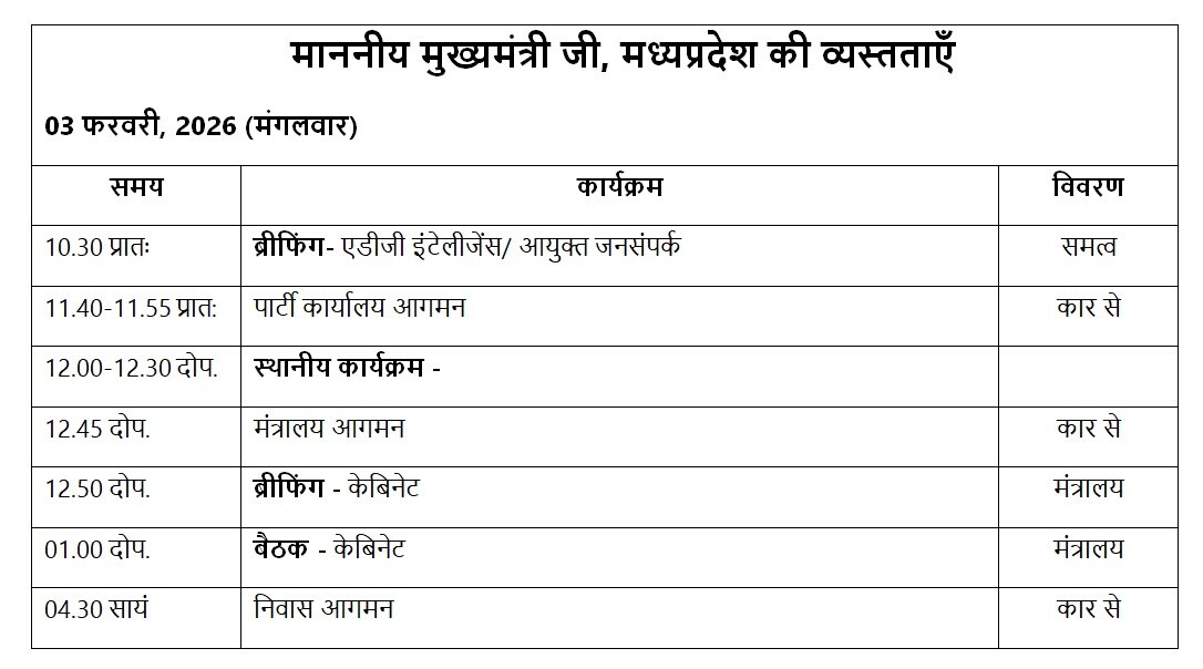मुख्यमंत्री डॉ. मोहन यादव आज एक व्यस्त दिन व्यतीत करेंगे. सुबह 11:40 बजे वे पार्टी कार्यालय पहुंचेंगे और स्थानीय कार्यक्रमों में शामिल होंगे. इसके बाद दोपहर 12:45 बजे मंत्रालय पहुंचकर कैबिनेट बैठक में हिस्सा लेंगे, जिसमें कई अहम फैसलों पर चर्चा होगी. शाम 4:30 बजे वे मुख्यमंत्री निवास लौटेंगे. पूरे दिन का कार्यक्रम जनता और अधिकारियों के लिए महत्वपूर्ण रहेगा, क्योंकि इसमें सरकारी नीतियों और स्थानीय मुद्दों पर विचार किया जाएगा. मुख्यमंत्री का यह दिन राजनीतिक और प्रशासनिक दृष्टि से काफी अहम माना जा रहा है.