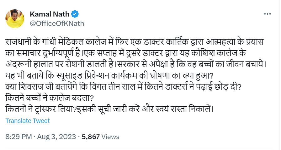 MBBS इंटर्न की सुसाइड की कोशिश मामले में कमलनाथ ने सरकार पर सवाल उठाए है। उन्होंने इस घटना को लेकर ये ट्वीट किया –