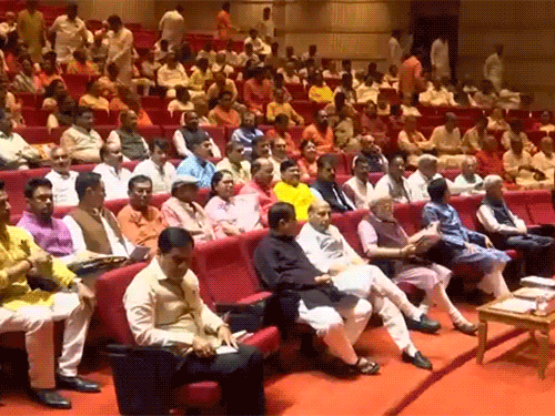 संसदीय दल की बैठक खत्म होने के बाद पीएम मोदी, राजनाथ सिंह, प्रहलाद जोशी के साथ मीटिंग हॉल से निकलते हुए।