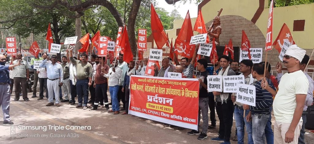 कोरबा। बढ़ती मंहगाई, बेरोजगारी व बेहाल अर्थव्यवस्था के खिलाफ वामपंथी पार्टियों के देशव्यापी आह्वान पर कोरबा में तानसेन चौक मार्क्सवादी कम्युनिस्ट पार्टी, भाकपा तथा भाकपा (माले) ने संयुक्त रूप से प्रदर्शन कर मोदी सरकार की नीतियों की जमकर खिलाफत की तथा नारेबाजी कर प्रदर्शन किया। वामपंथी पार्टियों के आह्वान पर मजदूर संगठन सीटू और एटक, छत्तीसगढ़ किसान सभा, जनवादी नौजवान सभा तथा आदिनिवासी गण परिषद जैसे जन संगठनों के कार्यकर्ता भी प्रदर्शन में शामिल हुए।