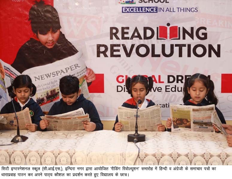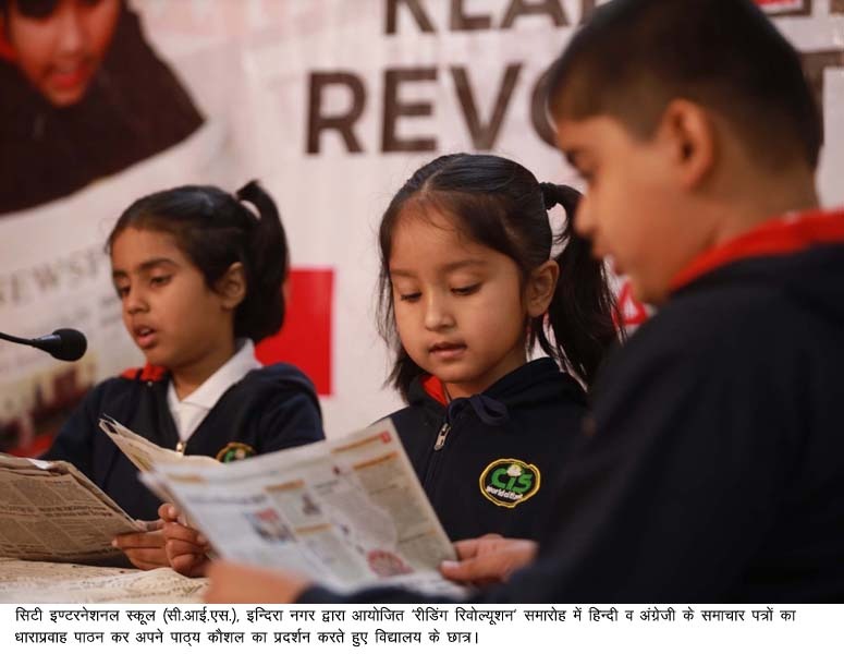 लखनऊ,। सिटी इण्टरनेशनल स्कूल (सी.आई.एस.), इन्दिरा नगर के 5 से 7 साल तक के नन्हें-मुन्हें छात्रों ने कई गणमान्य हस्तियों, अभिभावकों व बड़ी संख्या में उपस्थित दर्शकों के समक्ष हिन्दी व अंग्रेजी के समाचार पत्रों का धाराप्रवाह पाठन कर अन्य छात्रों को भी अखबार पढ़ने के लिए प्रेरित किया। मौका था विद्यालय द्वारा आयोजित ‘रीडिंग रिवोल्यूशन’ समारोह का। समारोह के मुख्य अतिथि श्री आलोक रंजन, आई.ए.एस.,पूर्व मुख्य सचिव, उ.प्र. ने छात्रों की प्रतिभा की भूरि-भूरि प्रशंसा की एवं विद्यालय द्वारा छात्रों के व्यक्तित्व विकास के प्रयासों को सराहा।