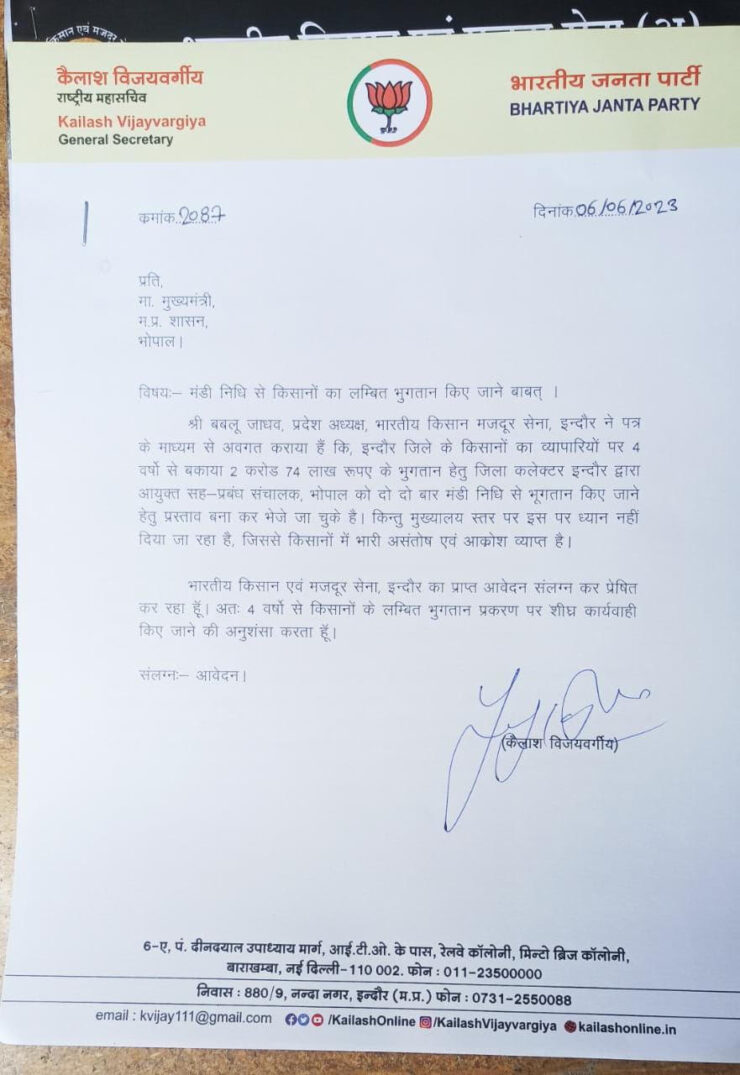 किसान संगठनों ने मध्य प्रदेश के मुख्यमंत्री से लेकर कई विधायकों और मंत्री तुलसी सिलावट, भाजपा के राष्ट्रीय महासचिव कैलाश विजयवर्गीय, सांसद शंकर लगवानी सहित सभी जनप्रतिनिधियों से अपने बकाया भुगतान को कराए जाने की मांग को लेकर ज्ञापन दिए हैं। जिस पर अनेकों जनप्रतिनिधियों ने सीधे मुख्यमंत्री को पत्र भी लिखे हैं ,लेकिन आज दिनांक तक किसानों के बकाया भुगतान को लेकर सार्थक निर्णय सरकार नहीं ले पाई है। लगता है कि मुख्यमंत्री कार्यालय में मंत्रियों और जनप्रतिनिधियों के पत्रों को भी कोई तवज्जो नहीं दी जाती है । जिसके चलते कई मंत्रियों द्वारा मुख्यमंत्री को लिखे गए पत्र भी रद्दी की टोकनी के हवाले कर दिए गए हैं।