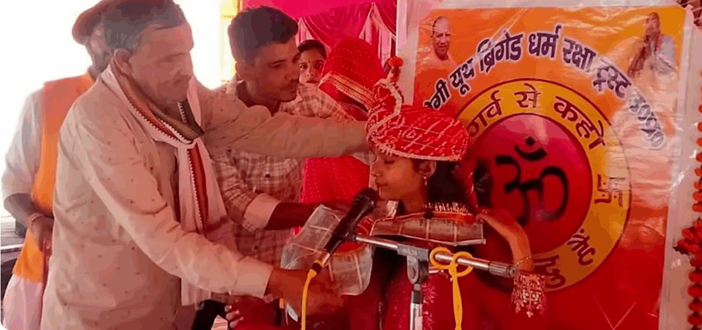 आगरा जिले के खेड़ा गांव में श्रीमद् भागवत कथा के दौरान एक नाबालिग कथावाचिका ने मुसलमानों के खिलाफ बेहद आपत्तिजनक और नफरत भरी भाषण दिया, जिसका वीडियो सोशल मीडिया पर तेजी से वायरल हो चुका है। ‘बाल विदुषी लक्ष्मी’ के नाम से व्यासपीठ पर विराजमान इस कथावाचिका की उम्र 18 वर्ष से कम लग रही है। वीडियो में लक्ष्मी ने हिंदुओं से मुसलमानों का आर्थिक बहिष्कार करने की अपील की और हर गांव के बाहर बोर्ड लगाने की मांग की, जिसमें साफ लिखा हो- ‘यहां पर मुसलमानों का प्रवेश वर्जित है’।