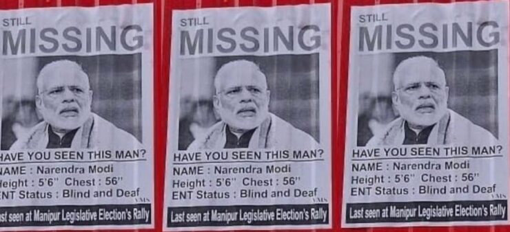 एक तरफ प्रधानमंत्री नरेंद्र मोदी अमेरिका और मिस्र की राजकीय यात्रा पर हैं, वहीं उनके घर भारत में उनकी गुमशुदगी के पोस्टर लग रहे हैं। व्हाट्सएप पर इस लेखक को चार चित्र मिले हैं। एक चित्र लापता नरेंद्र मोदी से सम्बंधित है। चित्र में दिखलाया गया है: “missing-have you seen this man?, name: Narendra Modi, height 5 ‘6’,chest 56’’, ENT status: Blind and Deaf; last seen at Manipur Election Rally. एक दूसरे चित्र में एक बच्ची के हाथों में एक पोस्टर है जिसमें लिखा हुआ है: Dear Mr. Modi, Manipur is Burning, 100 Deaths till now…Why Are You Silent?