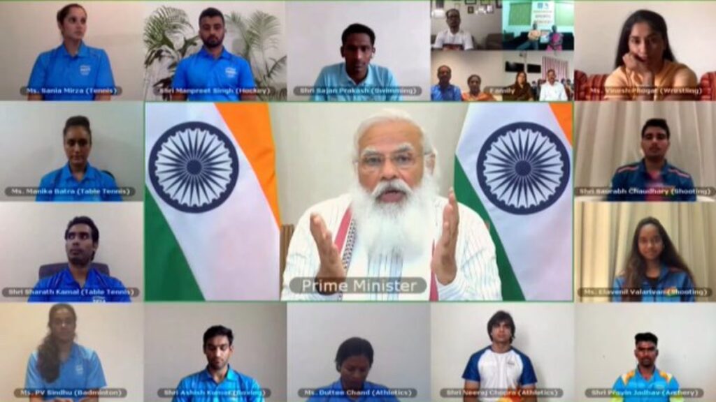 वीडियो कॉन्फ्रेंसिंग के जरिए एथलीट्स से बातचीत करते PM मोदी।