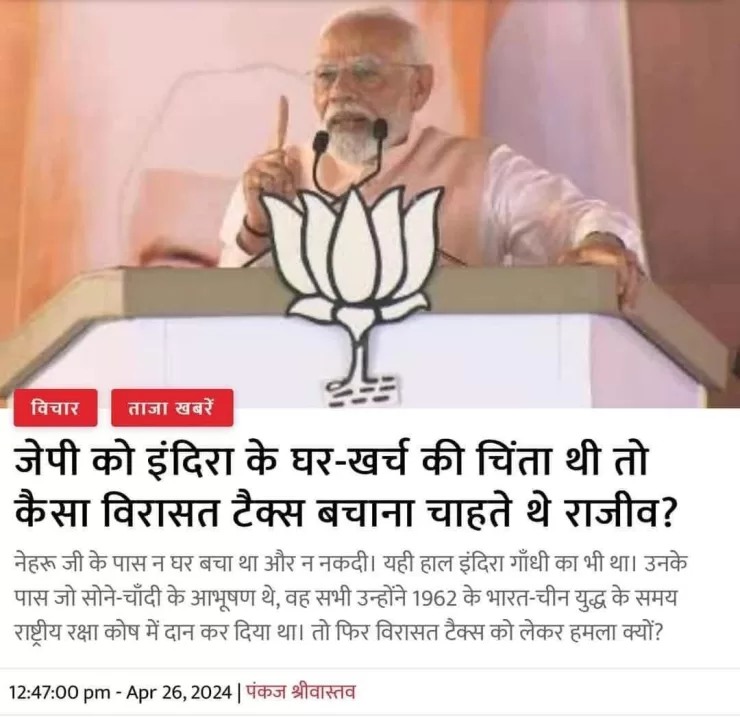 लेकिन भारत के प्रधानमंत्री नरेंद्र मोदी अपनी चुनावी रैलियों में बता रहे हैं कि इंदिरा गाँधी की छोड़ी गयी भारी-भरकम सम्पत्ति पर टैक्स न देना पड़े इसलिए राजीव गाँधी ने 1985 में ‘विरासत टैक्स’ हटा दिया था। दरअसल, वे चुनावी रैलियों में दावा कर रहे थे कि कांग्रेस की सरकार बनने पर पैतृक सम्पत्ति पर ‘विरासत टैक्स’ लगाया जाएगा। कथित मुख्यधारा मीडिया उनका भोंपू बनकर इसे प्रचारित भी कर रहा था। लेकिन सोशल मीडिया में यह बात उजागर कर दी कि कांग्रेस घोषणापत्र में विरासत टैक्स के बारे में कुछ भी नहीं कहा गया है और भारत में जो विरासत टैक्स लगता था उसे राजीव गाँधी के नेतृत्व वाली कांग्रेस सरकार ने ही ख़त्म किया था। इस रहस्योद्घाटन के बाद उन्होंने बैकफ़ुट पर जाने के बजाय राजीव गाँधी की मंशा पर सवाल उठाते हुए हमले का नया मोर्चा खोल दिया।