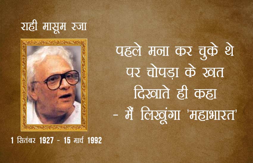डॉ राही मासूम रज़ा को बी आर चोपड़ा ने महाभारत टीवी सीरियल का स्क्रिप्ट लिखने को कहा तो पहले तो राही मासूम रजा ने इनकार कर दिया था। पर दूसरे दिन यह खबर न्यूज़ पेपर में छप गयी……. हज़ारों लोगों ने चोपड़ा को खत लिखा कि एक मुसलमान ही मिला है महाभारत लिखवाने के लिए! चोपड़ा ने सारे खत राही मासूम रजा के पास भेज दिये। सारे खत देखने के बाद राही मासूम रजा ने चोपड़ा से कहा कि अब मैं ही लिखूंगा महाभारत, क्योंकि मैं गंगा का पुत्र हूँ!