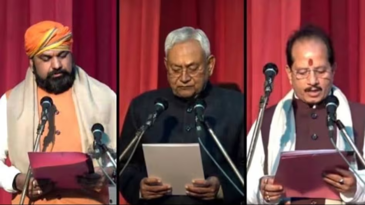 बिहार में राजनीतिक उठापटक का अंत हो गया। नीतीश कुमार ने 9वीं बार सीएम पद की शपथ ले ली है। उनके साथ आठ मंत्रियों ने शपथ ली। सम्राट चौधरी, विजय कुमार सिन्हा ने भी शपथ ग्रहण किया। उसके अलावा विजय कुमार चौधरी, बिजेंद्र प्रसाद यादव, श्रवण कुमार, संतोष सुमन और सुमित कुमार सिंह ने भी शपथ ली। बीजेपी के प्रेम कुमार को भी शपथ दिलाई गई। बाकी मंत्रियों के विभाग को एक दो दिनों के अंदर बांट दिया जाएगा।