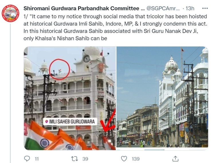 उधर अमृतसर में सिखों की सबसे बड़ी धार्मिक संस्था SGPC के प्रधान एडवोकेट धामी ने कहा कि सोशल मीडिया के जरिए मुझे MP के इंदौर में गुरुद्वारा इमली साहिब में तिरंगा फहराए जाने की बात पता चली है। मैं इसकी कड़ी निंदा करता हूं। श्री गुरु नानक देव जी से जुड़े इस ऐतिहासिक गुरुद्वारा इमली साहिब में केवल खालसा के निशान साहिब को ही फहराया जा सकता है।