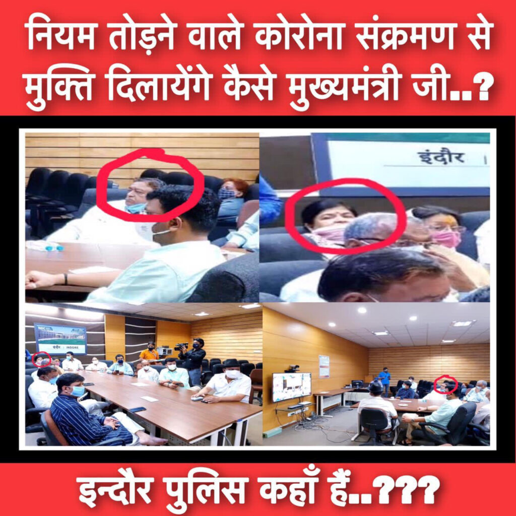 जिस मास को लेकर गरीब रिक्शा चालक की पिटाई करने वाली पुलिस और शायद क्राइसिस मैनेजमेंट ग्रुप से जुड़े नियमों का उल्लंघन करने वाले राजनेताओं पर दृष्टि नहीं पड़ीमुख्यमंत्री से इंदौर की स्थिति पर चर्चा करने के लिए एकत्रित हुए भाजपा के पदाधिकारी और प्रदेश की केबिनेट मंत्री मास्क नाक से नीचे लगाकर प्रदेश वासियों को साफ़ स्पष्ट संदेश दे रही हैं मास्क ऐसे ही लगाओ और कोरोना फैलाओ।दूसरा संदेश भाजपा के पूर्व विधायक का मास्क लगाने की ज़रूरत ही नहीं हैं माननीय मीटिंग में अपनी बुद्धिमत्ता का सर्वश्रेष्ठ प्रदर्शन करते हुए बता रहे हैं गोपी कृष्ण नेमा की मास्क ऐसा लगाये जैसा मैंने लगाया हैं।शायद यह सब ना तो मुख्यमंत्री को दिखाई दिया और ना ही इंदौर में नियमों का पालन कराने के लिए प्रतिबद्ध है कलेक्टर मनीष सिंह को जो स्वयं भी इस बैठक में मौजूद थेजनता समझ सकती हैं कैसे ग़ैरज़िम्मेदार भाजपा नेताओं और मंत्री कोरोना संक्रमण रोकने की क्राइसेस मैनेजमेंट की मीटिंग में शहर हित के निर्णय लेने वाले ही कोरोना प्रोटोकॉल समझते ही नहीं हैं।इन्दौर पुलिस क्या सिर्फ़ ग़रीबों पर ही डंडे का ज़ोर दिखायेगी या कभी इन माननीयों को सबक़ सिखा कर पुलिस वर्दी की इज़्ज़त क़ायम रखेगी। क्या इन जनप्रतिनिधियों पर कोविड -19 नियमों के उल्लंघन का प्रकरण दर्ज करने की हिम्मत इंदौर की बहादुर पुलिस दिखा पाएगी!