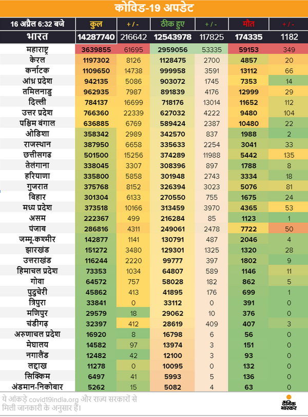 बहुत बुरी खबर है। देश में कोरोनावायरस से लगातार हालात बिगड़ते जा रहे हैं। पिछले 24 घंटे के अंदर देश में रिकॉर्ड 2 लाख 16 हजार 642 लोग संक्रमित पाए गए हैं। पिछले साल संक्रमण की शुरुआत से लेकर अब तक एक दिन में मिले संक्रमितों का ये आंकड़ा सबसे बड़ा है। इस दौरान 1 लाख 17 हजार 825 लोग ठीक भी हुए, जबकि 1182 मरीजों ने दम तोड़ दिया।