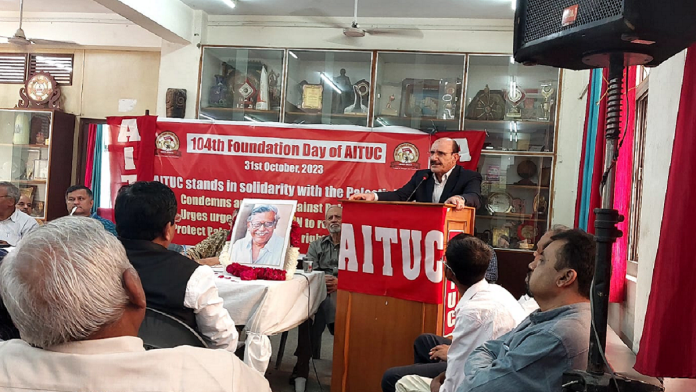 नई दिल्ली। दिल्ली में एटक मुख्यालय में भारतीय ट्रेड यूनियन आंदोलन में संगठन के 104वें स्थापना दिवस के मौके पर यूनियन की राष्ट्रीय महासचिव अमरजीत कौर और पार्टी सांसद एवं एटक के कार्यकारी अध्यक्ष बिनॉय विश्वम की अगुआई में दिल्ली-एनसीआर में यूनियन के तमाम पदाधिकारियों एवं कार्यकर्ताओं ने अपने आंदोलन के इतिहास को याद करते हुए फिलिस्तीन के साथ अपनी एकजुटता का इजहार किया। इस आयोजन में मेहमान एवं मुख्य वक्ता के तौर पर भारत में फिलिस्तीन के राजदूत अदनान मोहम्मद जाबेर हैजा भी उपस्थित थे।