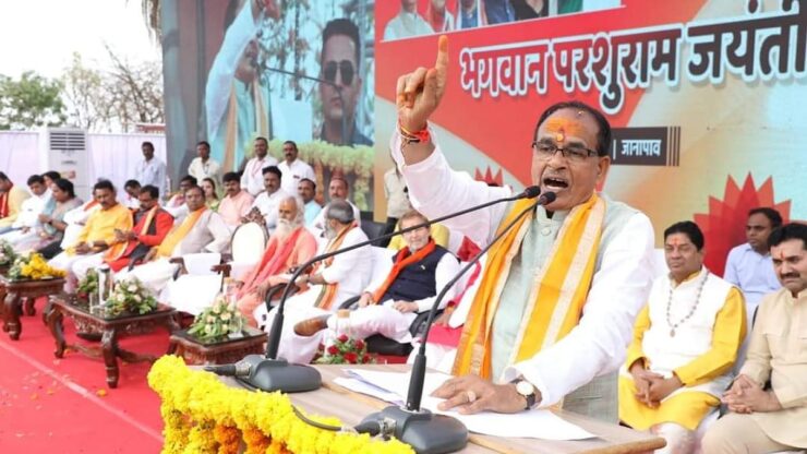 मध्य प्रदेश के इंदौर जिले के जनापाव में 23 अप्रैल, 2023 को परशुराम जयंती पर आयोजित ब्राह्मण सम्मलेन को संबोधित करते राज्य के मुख्यमंत्री शिवराज सिंह चौहान