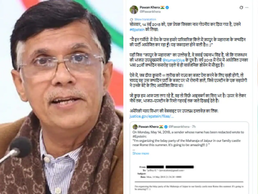 पवन खेड़ा ने दीया कुमारी के बेटे पद्मनाभ सिंह का रोम में मनाए गए बर्थडे और एपस्टीन से उनके रिश्ते को लेकर आरोप लगाए हैं. उन्होंने 11 फरवरी को राजस्थान विधानसभा में पेश होने वाले बजट 2026 को लेकर दीया कुमारी से बेटे पद्मनाभ और एपस्टीन के रिश्ते को लेकर खुलासा करने को कहा है.
