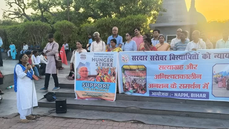 पटना। नर्मदा घाटी में डूब प्रभावित लोगों के लंबित पुनर्वास को लेकर प्रसिद्द समाजसेवी और जन आन्दोलनों की राष्ट्रीय नेत्री मेधा पाटकर 15 जून से अनशन पर बैठी हैं। इस अनशन के समर्थन में जन आंदोलनों का राष्ट्रीय समन्वय (एनएपीएम) की बिहार इकाई ने बुद्ध स्मृति पार्क, पटना के सामने एक सांकेतिक प्रदर्शन किया। इस प्रदर्शन में पटना के कई प्रबुद्ध नागरिक शामिल हुए।