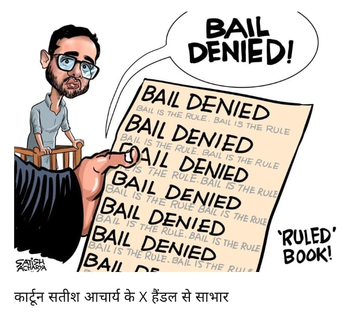 पांचवीं बार अदालत ने जमानत की अर्जी खारिज की है, अभी जेल में ही सड़ते रहेंगे। न कोई सबूत है और न कोई सुनवाई शुरू हुई है, पर जेल में ही एड़ियां रगड़ते रहेंगे। सिर्फ इसलिए कि इन्होंने शाहीन बाग वाले आंदोलन के टैम पर मोदीशाही का विरोध किया था, इनकी जवानी के बेशकीमती दिन यूं ही जेल की सलाखों के पीछे गुजरते रहेंगे। ये कहां का न्याय है?
