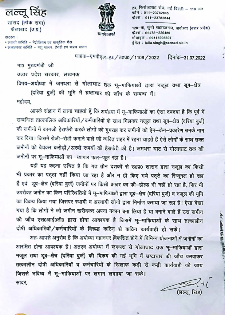 उन्होंने कहा कि बहुत साफ है कि मंदिर के नाम पर धंधा किया गया है। मैं बड़े दुख के साथ कहना चाहूंगा कि अयोध्या का विकास इसलिए रुक गया है कि उसने मेरे जैसे एक दलित को संसद में चुनकर भेजा है। भाजपा की इन्हीं गतिविधियों के कारण अयोध्या के मतदाताओं ने भाजपा को शिकस्त दी है। बड़े लोग जमीनें खरीद सकें इसलिए कई गरीबों की दुकानें और मकान तोड़े गये। उन्होंने पुनः मांग रखी कि सारे मामलों की उच्च स्तरीय जांच होनी चाहिए।