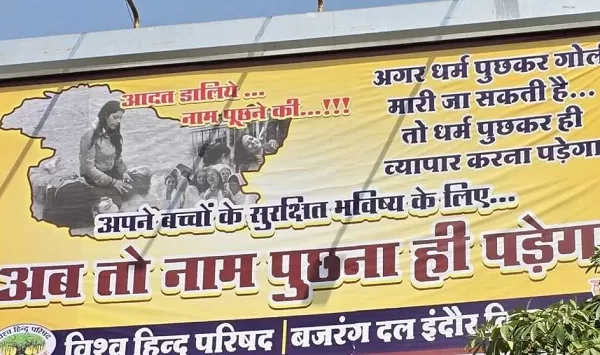 ऐसे ही कुछ पोस्टर मध्य प्रदेश की आर्थिक राजधानी इंदौर शहर में देखे गए हैं। जिसमें लिखा है, ‘अगर धर्म पूछकर गोली मारी जा सकती है तो धर्म पूछकर ही व्यापार करना पड़ेगा। अपने बच्चों के सुरक्षित भविष्य के लिए… अब तो नाम पूछना ही पड़ेगा। आदत डालिए नाम पूछने की…. ‘। ऐसे पोस्टर विश्व हिंदू परिषद, बजरंग दल इंदौर विभाग की तरफ से लगवाए गए हैं। इस पोस्टर में जम्मू-कश्मीर का नक्शा भी दिखाई दे रहा है, जिसके अंदर पहलगाम आतंकी हमले में मारे गए लेफ्टिनेंट विनय नरवाल का शव और उसके पास बैठीं उनकी पत्नी हिमांशी दिखाई दे रही हैं।