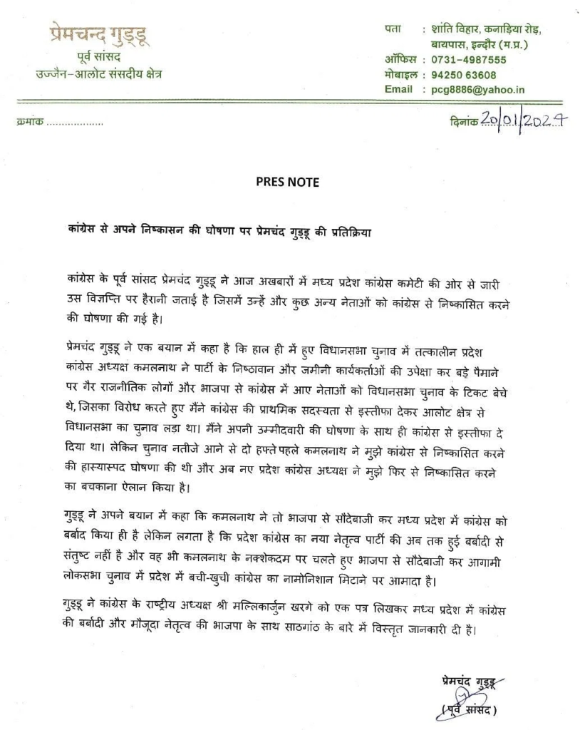 गुड्डू ने कांग्रेस द्वारा निष्कासन पर एक पत्र जारी कर कहा कि विधानसभा चुनाव के पहले ही वे अपना इस्तीफा तत्कालीन प्रदेश कांग्रेस अध्यक्ष कमलनाथ को दे चुके थे। लेकिन अब चुनाव के बाद उनका कांग्रेस से निष्कासन बचकाना एलान है। उन्होंने आरोप लगाते हुए कहा कि प्रदेश कांग्रेस अध्यक्ष कमलनाथ ने भाजपा से सौदेबाजी करते हुए कांग्रेस को बर्बाद किया था और अब नया नेतृत्व भी उन्हीं के नक्शे कदम पर चल रहा है। लोकसभा चुनाव में प्रदेश की बची-खुची कांग्रेस का नामो निशान भी मिटाने की कोशिश की जा रही है। उन्होंने कांग्रेस के राष्ट्रीय अध्यक्ष को पत्र लिखकर भाजपा से सांठगांठ किए जाने की विस्तृत जानकारी भेजी है।