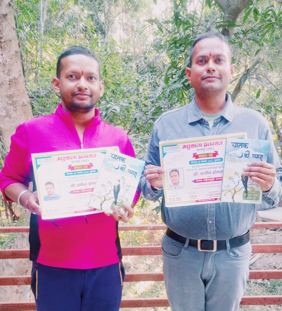 कांगड़ा के युवा कवि राजीव डोगरा और अमित डोगरा को मधुशाला प्रकाशन द्वारा प्रकाशित साझा काव्य संग्रह ‘चातक की प्यास’ में उत्कृष्ट सृजन के लिए साहित्यानुभूति सम्मान देकर सम्मानित किया गया। गौरतलब है इस पुस्तक में देश के विभिन्न प्रदेशों के कवियों की कविताएं शामिल है जिसमें हमें कांगड़ा के अमित और राजीव की कविताएं भी पढ़ने को मिलेंगे। सम्मानित होने पर तथा नई पुस्तक आने पर अमित और राजीव के माता-पिता हंसराज और सरोज कुमारी तथा शिमला के रोशन जसवाल (साहित्यकार और रिटायर्ड ज्वाइंट डायरेक्टर शिक्षा विभाग हिमाचल प्रदेश) ,रविंदर नरयाल (खण्ड स्त्रोत केंद्रीय समन्वयक खण्ड कांगड़ा के बी.आर.सी),प्रिंसिपल नीरज गर्ग (गवर्नमेंट सीनियर सेकेंडरी स्कूल गाहलियां),धराधाम इंटरनेशनल संस्था के संस्थापक डॉ सौरभ पांडे ने अत्यंत खुशी व्यक्त की और ऐसे ही आगे बढ़ते रहने के लिए उत्साहित किया।
