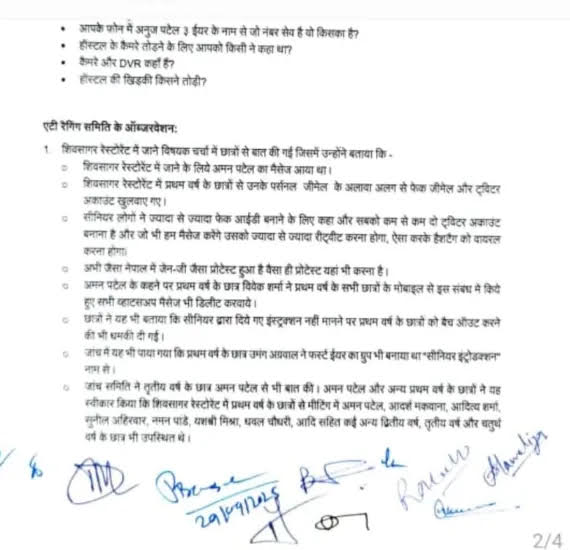 एंटी रैगिंग कमेटी ने केस दर्ज करने की सिफारिश की एंटी रैगिंग कमेटी ने यूनिवर्सिटी से कहा है कि मामला बेहद गंभीर है और दोषी छात्रों पर कई धाराओं में केस दर्ज होना चाहिए। कमेटी ने कहा कि छात्रों पर एफआईआर दर्ज कराई जाए और साथ ही साइबर सेल के माध्यम से शिवसागर रेस्टोरेंट में शामिल होने वाले अन्य वरिष्ठ छात्रों की भी पहचान कर उन्हें सजा दी जाए।