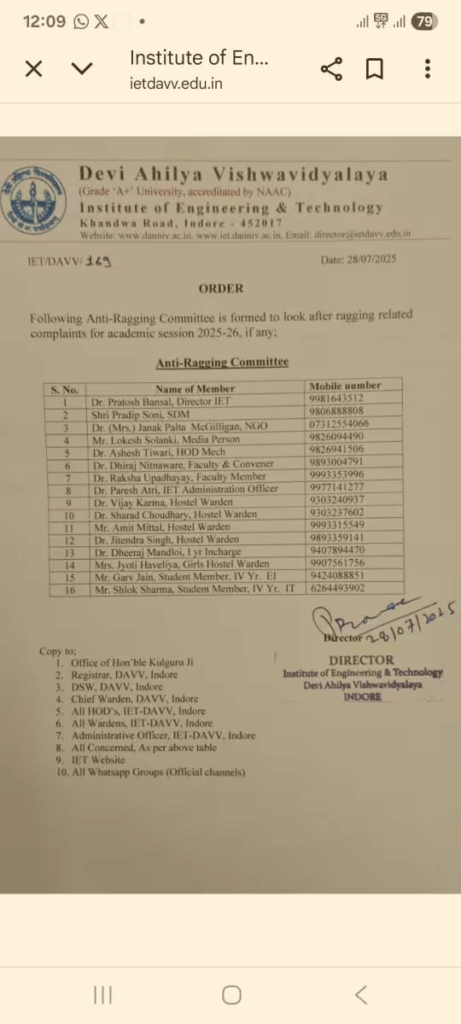इंदौर की देवी अहिल्या यूनिवर्सिटी के आईईटी (इंस्टीट्यूट ऑफ इंजीनियरिंग एंड टेक्नोलॉजी) संस्थान में जेन-Z आंदोलन की तैयारी चल रही थी। इसका खुलासा एंटी रैगिंग कमेटी की रिपोर्ट में हुआ है।
