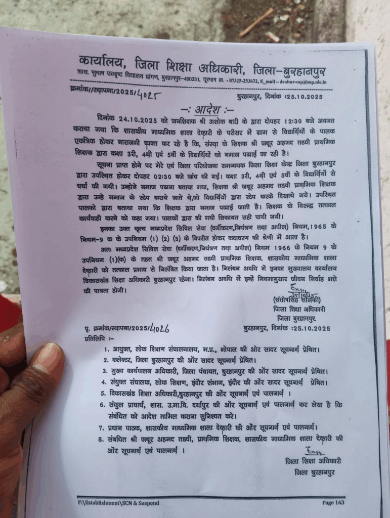 मामले की जानकारी लगते ही हिंदू जागरण मंच के पदाधिकारी भी गांव पहुंच गए और बच्चों और उनके पालकों से बातचीत की. इस दौरान बच्चों ने बताया कि उनके टीचर जबूर अहमद तड़वी ने सूर्य नमस्कार की जगह हमें नमाज पढ़ना सिखा रहे हैं. इस पूरे मामले में हिंदू जागरण मंच ने आरोपित शिक्षक के खिलाफ सख्त से सख्त कार्यवाही की मांग की. मामले की गंभीरता को देखते हुए जिला शिक्षा अधिकारी संतोष सिंह सोलंकी ने शिक्षक को निलंबित कर दिया है. मामले की जांच की जा रही है.