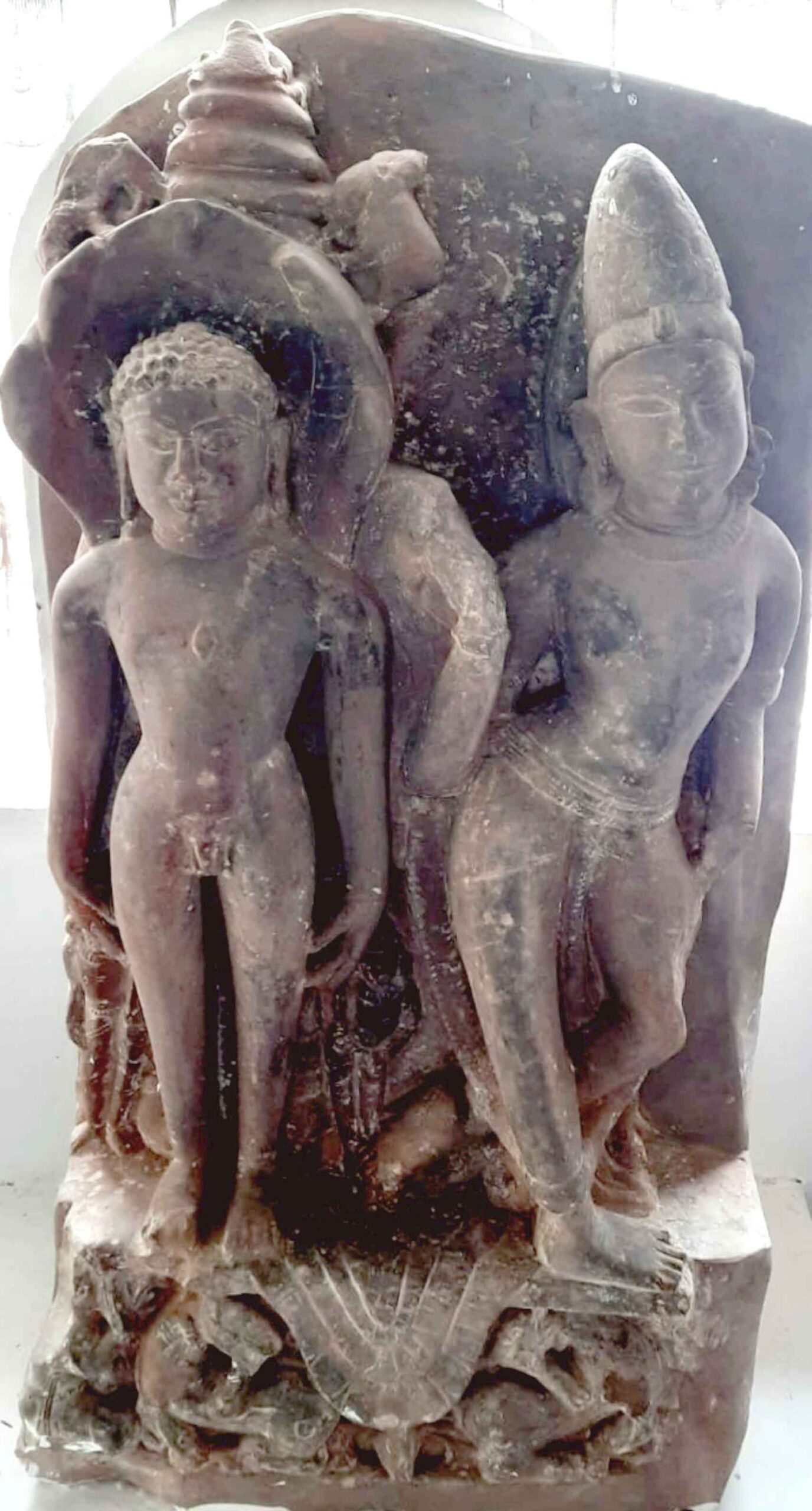 डॉ. जिनेन्द्र कुमार जैन ने इस प्रतिमा का अच्छा परिचय लिखा है किन्तु उन्होंने इस प्रतिमा के सप्त फण आच्छादित लिखा है जबकि पांच फण हैं। दायीं ओर दूसरी आकृति त्रिभंग मुद्रा में एक पुरुष की आकृति है, जिसे राजसी अलंकारों से अलंकृत किया गया है। कानों में कर्णावतंस, गल-मौक्तिक हार, सुन्दर मुकुटाटोप, सिर के पीछे प्रभामण्डल, भुजबंध, कटिसूत्र, पैजनिया व अधोवस्त्र आदि से अलंकृत है। पुरुष आकृति की दोनों हथेलियाँ टूटी हुई हैं, इससे ज्ञात नहीं होता है कि हाथ में क्या धारण किये है।  दोनों आकृतियाँ एक ही एक ही सिंहासन पर स्थित हैं। आसान में नीचे बीच में चक्र के दोनों ओर विरुद्धाभिमुख दो सिंह, उनके ऊपर चौकी, उसपर आसन जो आगे की ओर पलासना जैसा लटक रहा है। विश्लेषण- तीर्थंकर के तो पार्श्वनाथ के प्रायः सभी लक्षण सपरिकर होने से स्पष्ट हैं कि यह भगवान पार्श्वनाथ प्रतिमा है। समानान्तर पुरुषाकृति को पार्श्वनाथ के साथ एक ही आसन पर समानता का स्थान दिये जाने से प्रतीत होता है कि यह प्रतिमा पार्श्वनाथ की राजकुमारावस्था की प्रतिकृति है।