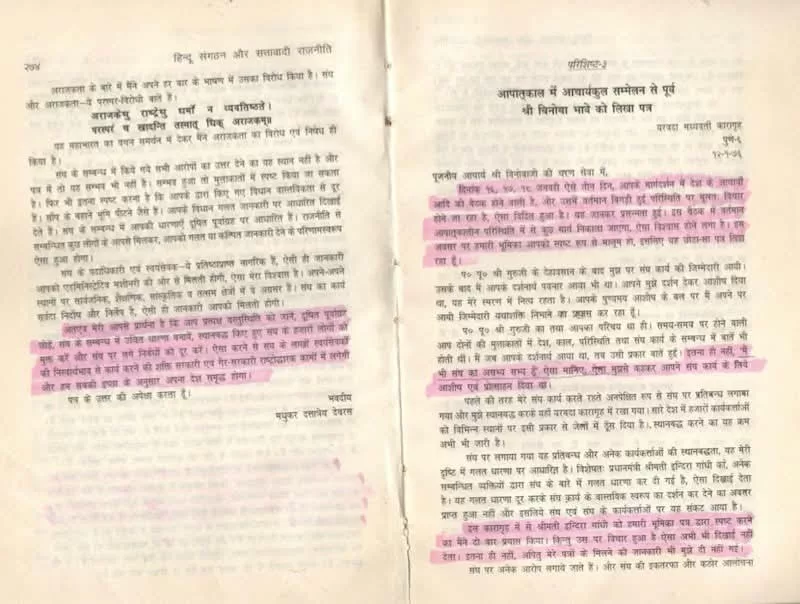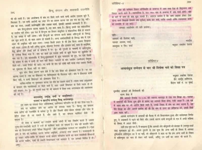 ”अख़बारों में छपी सूचनाओं के अनुसार प्रधानमंत्री (इंदिरा गाँधी) 24 जनवरी को वर्धा, पवनार आश्रम में आपसे मिलने आ रही हैं। उस समय देश की वर्तमान परिस्थिति के बारे में उनकी आपके साथ चर्चा होगी। मेरी आपसे याचना है कि प्रधानमंत्री के मन में आरएसएस के बारे में जो ग़लत धारणा घर कर गई है, आप कृपया उसे हटाने की कोशिश करें, ताकि आरएसएस पर लगा प्रतिबंध हटाया जा सके और जेलो मे बंद आरएसएस के लोग रिहा होकर प्रधानमंत्री के नेतृत्व में देश की प्रगति के लिए सभी क्षेत्रों में अपना योगदान कर सकें।’’