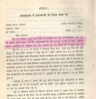 ”मैंने 15 अगस्त, 1975 को रेडियो पर लाल क़िले से राष्ट्र के नाम आपके संबोधन को यहां कारागृह (यरवदा जेल) में सुना था। आपका यह संबोधन संतुलित और समय के अनुकूल था। इसलिए मैंने आपको यह पत्र लिखने का फ़ैसला किया।’’