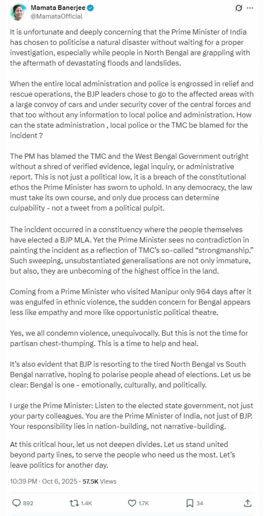 पीएम मोदी के एक्स पोस्ट आने के लगभग दो घंटे बाद 386 शब्दों के विस्तृत एक्स पोस्ट में ममता बनर्जी ने अपने आक्रामक तेवर दिखाए। उन्होंने कहा कि राज्य सरकार और मौसम की मार झेल रहे इलाकों में स्थानीय प्रशासन के साथ मिलकर राहत और बचाव कार्य की योजना पर काम कर रही है, तो दूसरी तरफ भारत के प्रधानमंत्री ने बिना किसी सत्यापित सबूत, कानूनी जांच या प्रशासनिक रिपोर्ट के टीएमसी, पश्चिम बंगाल सरकार को दोषी ठहरा दिया। यह केवल राजनीतिक नीचता ही नहीं बल्कि सांविधानिक मूल्यों का उल्लंघन भी है।