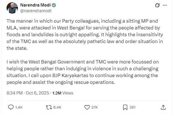 पश्चिम बंगाल के दोनों राजनीतिक प्रतिद्वंद्वी- सत्ताधारी दल- तृणमूल कांग्रेस और विपक्षी पार्टी- भाजपा एक-दूसरे पर जुबानी हमले का कोई भी अवसर नहीं गंवाते। हालांकि, ताजा मामले में मुख्यमंत्री ममता बनर्जी ने सीधे तौर पर प्रधानमंत्री नरेंद्र मोदी की आलोचना की है। पश्चिम बंगाल में भाजपा नेताओं पर हमले की आलोचना के मामले में पीएम मोदी पर बिफरीं सीएम ममता बनर्जी ने कहा, ‘प्राकृतिक आपदा का राजनीतिकरण दुर्भाग्यपूर्ण है।’ यह भी रोचक है कि सीएम ममता ने पीएम मोदी जिस एक्स पोस्ट के माध्यम से निशाना साधा है, उसमें उन्होंने एक बार भी प्रधानमंत्री मोदी का नाम नहीं लिखा।