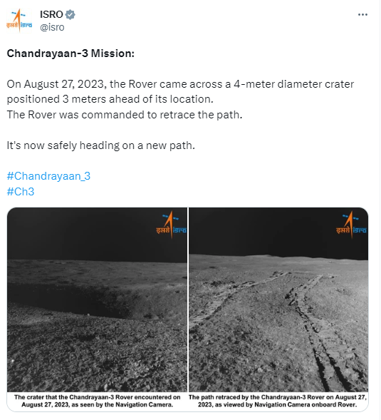 इसरो ने बताया है कि 27 अगस्त को चंद्रयान-3 के प्रज्ञान रोवर के सामने 4 मीटर चौड़ा क्रेटर यानी गड्ढा आ गया था। ये रोवर से 3 मीटर आगे था। ऐसे में रोवर को रास्ता बदलने का कमांड दिया गया। रोवर के ऑपरेशन सेमी-ऑटोनॉमस हैं। इसे चलाने के लिए ग्राउंड स्टेशन से कमांड दिए जाते हैं।