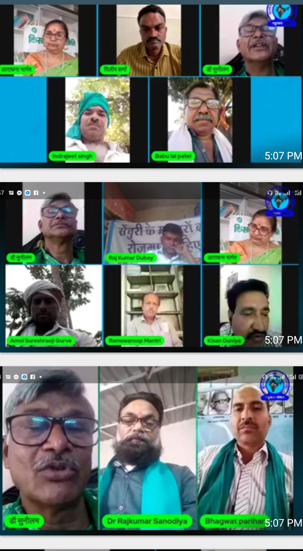 संयुक्त किसान मोर्चा, मध्यप्रदेश की ऑनलाइन बैठक में भोपाल राजभवन के समक्ष एक दिवसीय धरना देने तथा राज्यपाल को ज्ञापन सौंपने का निर्णय लिया गया है। किसान संगठनों द्वारा सभी जिले में जिलाधीश के माध्यम से राज्यपाल के नाम ज्ञापन सौंपे जाएंगे ।ऑनलाइन बैठक में सभी नागरिक संगठनों,किसान संगठनों, महिला संगठनों,मजदूर संगठनों से अपील की है कि 26 जून को प्रदेश भर में होने वाले आंदोलन में बढ़ चढ़कर हिस्सा लें।   बैठक में किसानों ने बताया कि प्रदेश में मानसून आ गया लेकिन अभी तक किसानों को खाद, बीज पर्याप्त मात्रा में सोसायटियों से नहीं मिला है। जिसके चलते किसानों को बाजार से  उच्च दामों पर तथा निम्न गुणवत्ता का खाद बीज लेना पड़ रहा है।विगत वर्ष फसल खराब होने के बावजूद प्रधानमंत्री फसल बीमा योजना का लाभ नहीं मिला ना ही सरकार द्वारा मुआवजा दिया गया। किसानों ने यह भी कहा कि सरकार एमएसपी वृद्धि का ढिंढोरा पिट रही है लेकिन  फसलों की जो एमएसपी तय की गई है उस पर भी मंडियों में खरीद नही होने से किसानों को काफी नुकसान सहना पड़ रहा है। लॉकडाउन में मंडियां बंद होने पर व्यापारियों को अनाज बेचना पड़ा। रायसेन ,इंदौर,धामनोद, सांची, खरगोन के किसानों से करोड़ों रूपये की उपज लेकर व्यापारी फरार हो गए है। 4 जून से  ग्रीष्मकालीन मूंग की खरीद शुरू करने को लेकर मध्यप्रदेश के कृषि मंत्री कमल पटेल की घोषणा के बावजूद अभी तक खरीदी शुरू नहीं हुई  है। छिंदवाड़ा में अडानी थर्मल पावर प्लांट बनाना चाहता है जिसका किसान विरोध कर रहे है क्योंकि 24 गांव के लोगों का पीने का पानी जहरीला हो जाएगा।    ऑन लाइन बैठक में  बादल सरोज (सचिव,अखिल भारतीय किसान सभा), डॉ सुनीलम (अध्यक्ष,किसान संघर्ष समिति), इरफान जाफरी, (किसान जागृति संगठन), प्रहलाद दास बैरागी (अखिल भारतीय किसान सभा-अजय भवन), बाबू सिंह राजपूत, (क्रांतिकारी किसान मजदूर संगठन-भोपाल),जसविंदर सिंह (अखिल भारतीय किसान सभा), इंद्रजीतसिंह (शहीद राघवेंद्र सिंह किसान संघर्ष समिति), एड आराधना भार्गव (उपाध्यक्ष, किसान संघर्ष समिति), संदीप ठाकुर (भारतीय किसान श्रमिक जनशक्ति युनियन), कॉ. उर्मिला, कॉ फाहिम (अखिल भारतीय क्रांतिकारी किसान सभा), माधुरी बहन (जागृत आदिवासी दलित संगठन,बड़वानी ) राजकुमार सिन्हा (बर्गी बांध विस्थापित संघ), बाबूलाल पटेल,सुबोध कुमार शर्मा (भारतीय किसान युनियन,नरसिंहपुर), बबलू जाधव,सोनू शर्मा, (भारतीय किसान एवं मजदूर सेना),  ललित कुमार (राष्ट्रीय अध्यक्ष अखिल भारतीय ओबीसी महासभा भोपाल),  दिलीप शर्मा (किसान क्रांति, छतरपुर), प्रदीप आरबी, मनीष श्रीवास्तव ( एआई केकेएमएस), प्रहलाद सिंह हाडा (सुजालपुर),  मुकेश भगोरिया (नर्मदा बचाओ आंदोलन), अशोक तिवारी (मुरैना), योगेश तिवारी (हरद