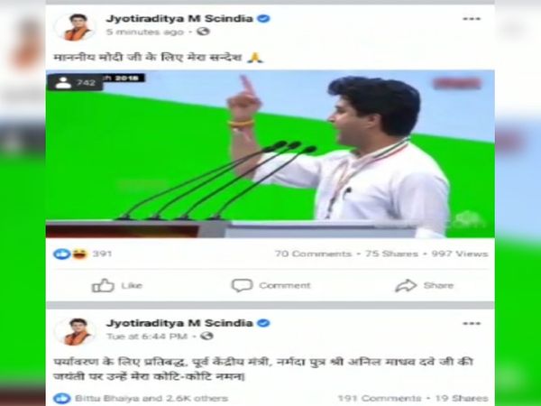 केंद्रीय मंत्री ज्योतिरादित्य सिंधिया के मोदी कैबिनेट में शामिल होने के साथ ही उनका फेसबुक अकाउंट हैक होने की खबर तेजी से वायरल हो रही है। बताया जा रहा है कि किसी ने रात 12:23 बजे उनकी फेसबुक वॉल पर प्रधानमंत्री नरेंद्र मोदी के खिलाफ आक्रामक भाषण वाले पुराने वीडियो अपलोड कर दिए। इनमें वे मोदी सरकार की कमियां गिनाते हुए दिखाई दे रहे हैं। वीडियो उस वक्त के हैं, जब सिंधिया कांग्रेस में हुआ करते थे।