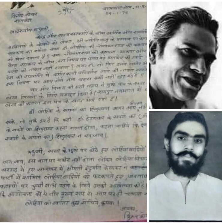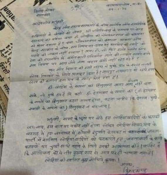 (दिनांक 29 जनवरी1978को, जब मेरे द्वारा बालाघाट जिले में छेड़े गए एक किसान आंदोलन के चलते, जब मैं तत्कालीन जनतापार्टी शासन की पुलिस द्वारा गिरफ्तार किया जाकर, बालाघाट जेल में बंद था, मैंने मेरे प्रेरणास्रोत व आपातकाल के काले दिनों में करीब14महीनों तक मेरे जेलसाथी रहे महान समाजवादी नेता, चिंतक, लेखक, सांसद और तत्कालीन सत्तारूढ़ जनता पार्टी के महामंत्री मधु लिमये को एक पत्र लिखा था जिसकी कार्बन कॉपी मेरे संग्रहित दस्तावेजों में मुझे प्राप्त हुई है जिसे पढ़कर मुझे लग रहा है कि उस पत्र का पूरा का पूरा मजमून, वर्तमान राजनीतिक परिदृश्य के संदर्भ में,45सालों बाद, आज भी प्रासंगिक है।इसीलिए उसे मैं शेयर कर रहा हूँ।)
