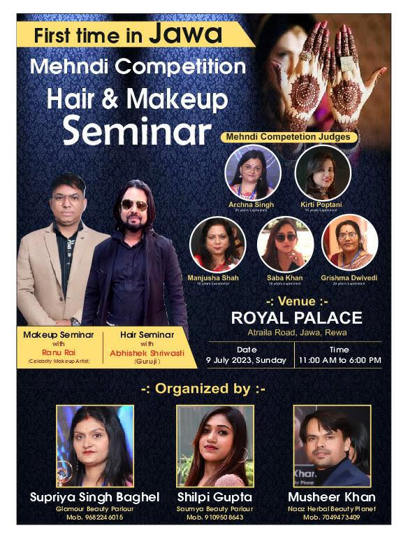 9 जुलाई को पहली बार रीवा ज़िले के जवा की धरती में एक बहुत ही बड़ा मेकअप और बालो का सेमिनार रॉयल पैलेस जवा में होने जा रहा है जिसमे विशेष अतिथि के रुप में गोल्ड मेडलिस्ट राष्ट्रीय पुरुष्कार विजेता अभिषेक गुरु जी और सेलिब्रिटी मेकअप आर्टिस्ट पुरुस्कार विजेता रानू राय होगे और अपनें हुनर और बिजनेस को कैसे बेहतर बनाना है वो सभी चीजे बताई जाएगी इस कार्यक्रम में मेहदी आर्टिस्ट के लिए एक मेहदी प्रतियोगिता भी रखी गई है जिसके माध्यम से आप अपनी प्रतिभा दिखा सकेंगे इसको जज करने के लिए रीवा से अर्चना सिंह कीर्ति पोपतानी सतना से मंजूषा साह सना खान और सीधी से ग्रीष्मा द्विवेदी उपस्थित रहेगी जिन्हे इस लाईन का अच्छा अनुभव है कार्यक्रम का अयोजन सुप्रिया सिंह बघेल शिल्पी गुप्ता और मुसीर खान ने किया है इस कार्यक्रम दीपिका श्रीवास्तव अनिता केसरवानी दिव्या केसरवानी मंगल सेन और कई लोगो का अच्छा सहयोग हमेशा रहा है वही सुप्रिया सिंह बघेल ने इस सेमिनार में मेकअप और बालो से जुडी ब्यूटी पार्लर को चलाने वाले लोगो से कार्यक्रम में पहुंचने की अपील की है